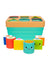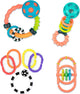The Sassy Sushi Sorter has textural sushi shaped into circles, triangles, and squares. Each sushi is colored to help baby sort the sushi through the same color and shape on the lid of the sorter. The Sushi themselves are textured and soft for baby to mouth and explore for tactile development. As the baby matures, help them line up the sushi in a row. This activity is the first step in understanding the principles of engineering and construction.