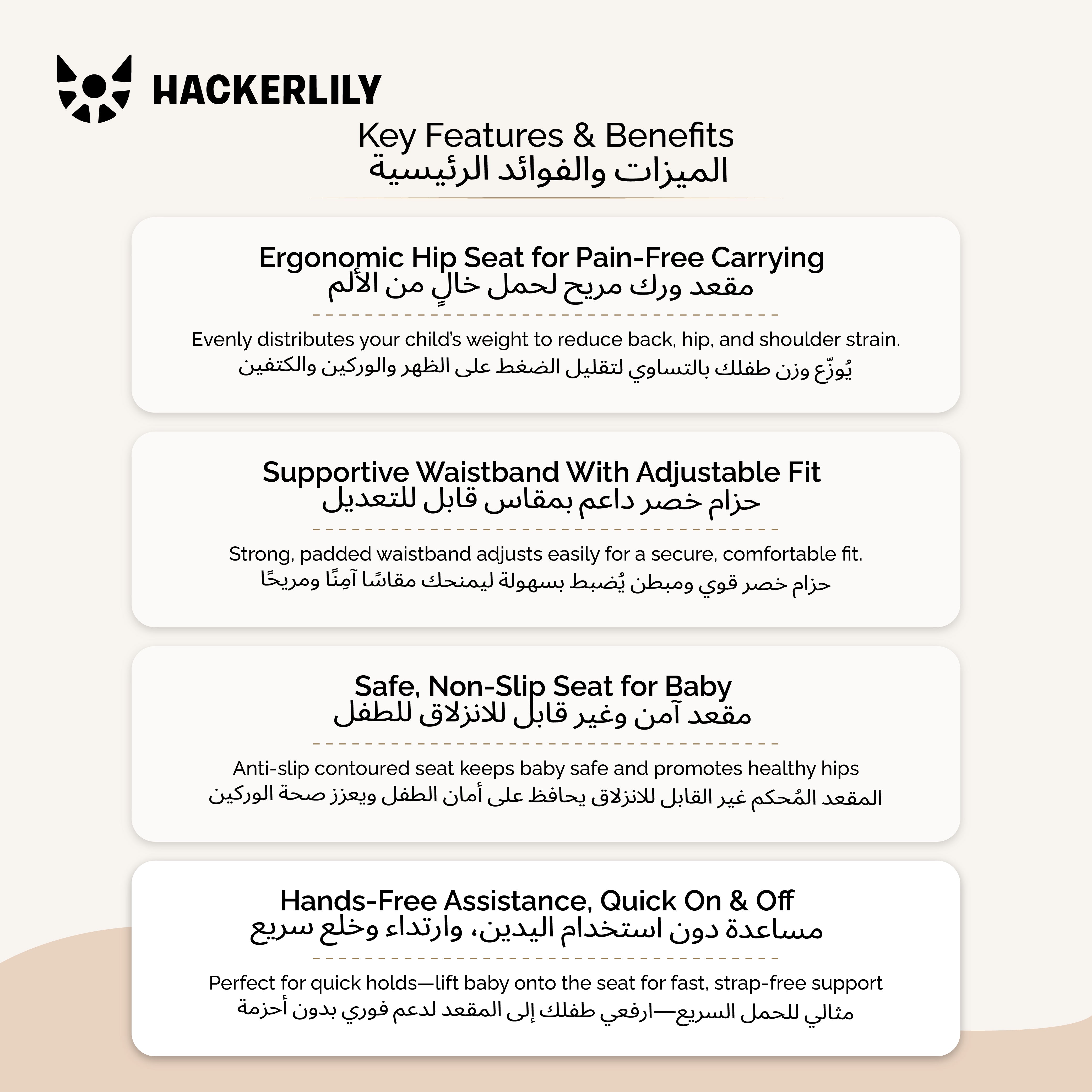 Designed for modern parents, this ergonomic hip seat baby carrier offers instant support without straps. The structured seat absorbs your child’s weight, helping reduce back, hip, and shoulder strain during daily routines.
